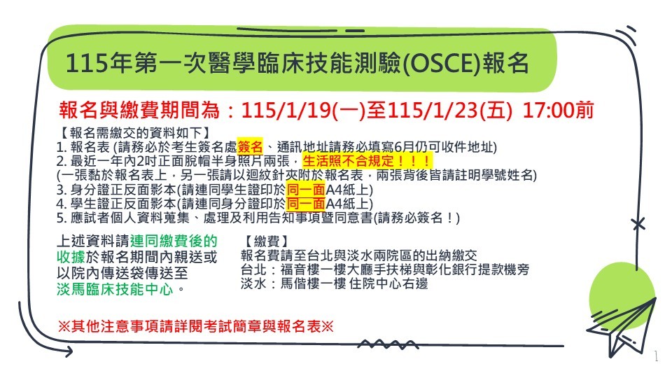 [2026/01/12] 115年第一次醫學臨床技能測驗(OSCE)報名
