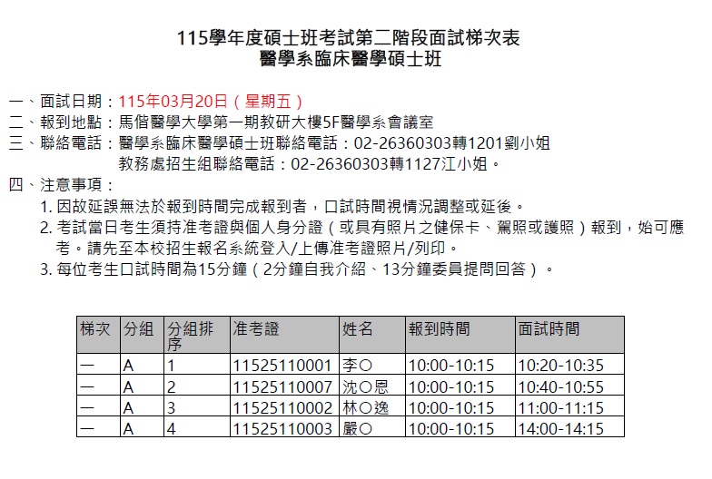 [2026/03/05] 馬偕醫學大學 醫學系臨床醫學碩士班115學年度碩士班考試入學面試流程